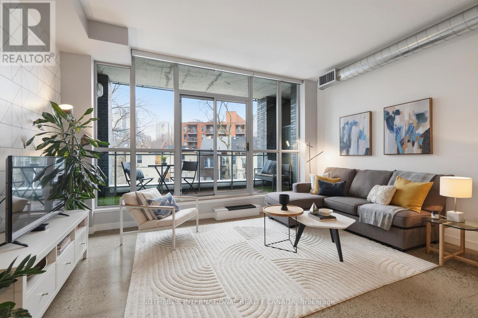 Welcome to stylish loft living at 510 King Street East #215, a bright and spacious one bedroom suite in the heart of Toronto's vibrant Corktown district. Offering approximately 650 sq. ft., this thoughtfully designed home features soaring 10-foot ceilings, cool modern concrete floors, and floor-to-ceiling windows that fill the space with natural light. Quietly positioned on the backside of the building, the suite enjoys a peaceful setting rarely found in the city. A walk-out from the living area extends your living space outdoors, perfect for morning coffee or evening unwinding. The favourable open-concept layout maximizes flow and functionality, creating an inviting space for both daily living and entertaining. The modern kitchen integrates seamlessly into the living and dining areas, while the well-proportioned bedroom offers comfort and privacy, complemented by a walk-in closet. A rare and valuable feature, this unit includes one of the larger parking spaces in a prime location, with EV chargers available in visitor parking, an exceptional convenience for city living. Residents of this boutique building enjoy premium amenities including a fully equipped fitness centre, stylish party and lounge spaces, rooftop terrace with city views, and concierge service making it one of Corktown's most desirable addresses. Located in the sought-after Corktown neighbourhood, you are surrounded by beloved cafés, restaurants, and local shops, with the Distillery Historic District, Corktown Common, and St. Lawrence Market just minutes away. Easy access to trails, transit, and the downtown core offers the perfect balance of green space, historic charm, and urban convenience. Experience the character, connectivity, and lifestyle that make Corktown one of Toronto's most exciting places to call home. (id:61483)