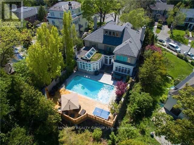 Nestled on one of Lawrence Park's most desirable streets, this beautifully appointed three-storey home offers exceptional space, comfort, and timeless style for modern family living. Featuring 4+1 bedrooms, generous principal rooms, and elegant finishes throughout, the thoughtfully designed layout provides both functionality and sophistication. The main level showcases a bright, open-concept family room anchored by a stunning chef's kitchen complete with striking onyx countertops and premium appliances, including a Wolf six-burner gas range. Abundant cabinetry, ample counter space, and both breakfast bar and eat-in dining options make this kitchen ideal for everyday living and entertaining alike. Separate living and dining rooms provide refined spaces for hosting, highlighted by a charming wood-burning fireplace in the living room. Two additional gas fireplaces, located in the family room and the primary bedroom, add warmth and character. The upper levels offer spacious, well-proportioned bedrooms designed to accommodate a growing family. The finished lower level features a large recreation room and a versatile nanny or guest suite, currently configured as a media room with built-in speakers. Step outside to a private backyard retreat featuring a pool perfect for summer entertaining, outdoor dining, and relaxation. Additional highlights include a private drive and built-in garage. Ideally located just minutes from top-rated schools, including Blythwood Junior Public School, beautiful green spaces such as Sherwood Park, and the shops and restaurants along Yonge Street, this home offers an exceptional opportunity to live in one of Toronto's most sought-after neighbourhoods. (id:61483)