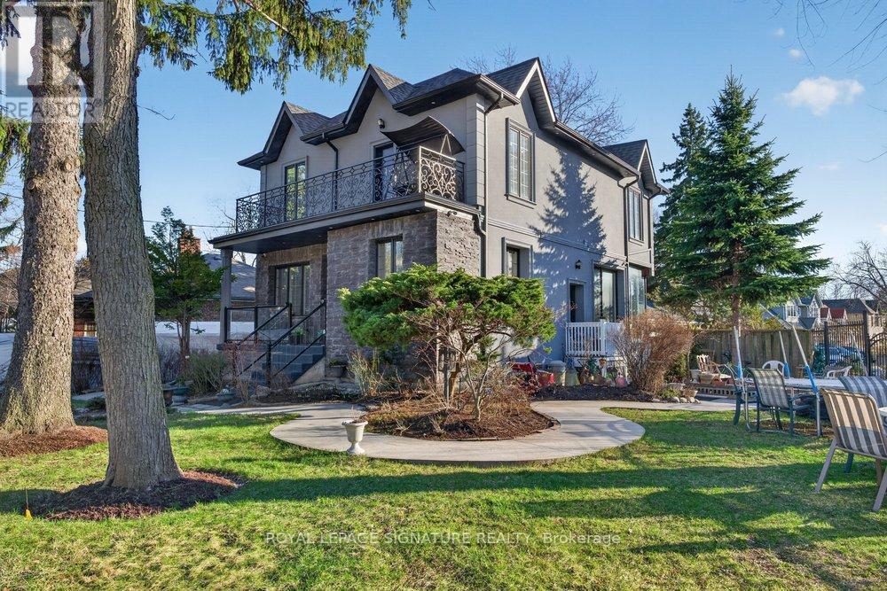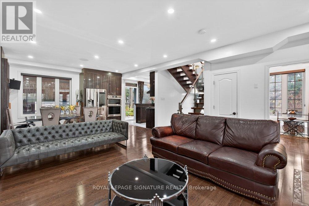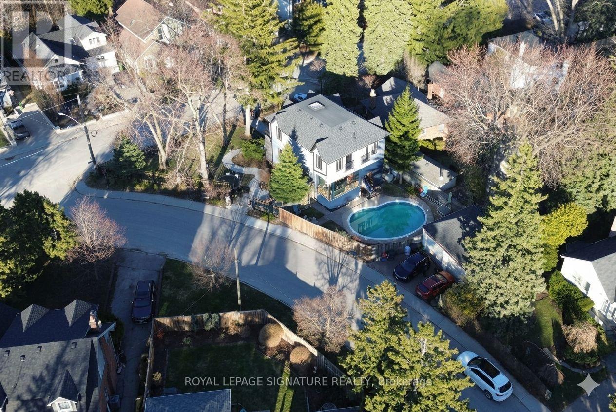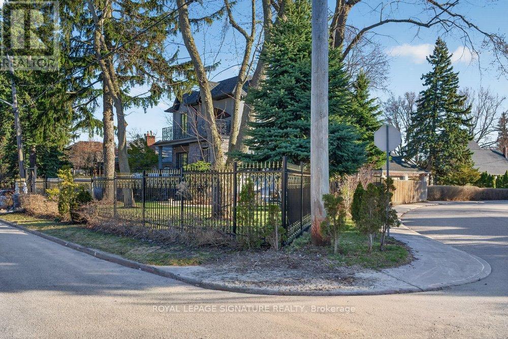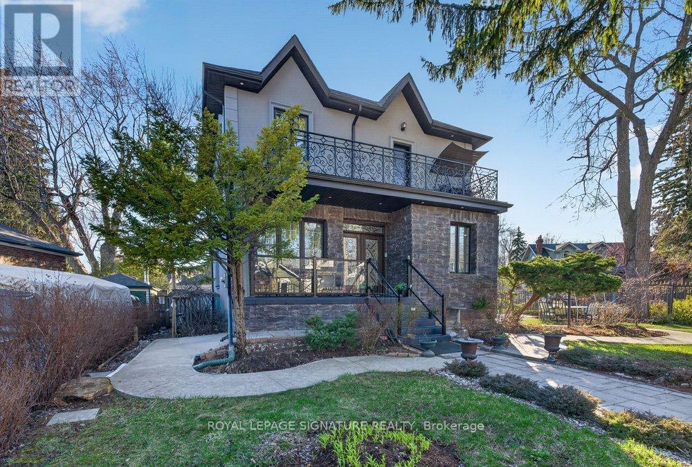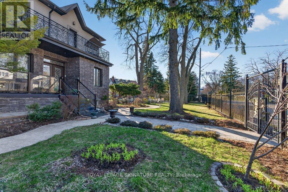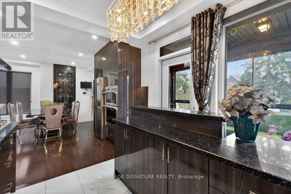 WOW On Cliffcrest! Situated on a rare, massive corner lot, this custom-built estate masterfully blends architectural scale with chic, modern refinement. The meticulously landscaped grounds frame the property from every angle, offering a lush sanctuary for garden enthusiasts and an expansive outdoor arena designed for high-end entertaining.The main level unfolds with an airy, open-concept living and dining floor plan, anchored by rich hardwood floors and oversized windows that invite a steady flow of natural light. The glamourous chef's kitchen serves as a stylistic focal point, featuring granite countertops, a custom backsplash, and premium stainless steel appliances, including a wall oven and gas cooktop. Enveloped by floor-to-ceiling glass, the kitchen leads directly to a fully enclosed sunroom-a tranquil space for morning coffee. A dedicated main-floor office provides a sophisticated environment for professional pursuits.Ascend to the second floor, where soaring ceilings and a central skylight create an airy, voluminous atmosphere. The primary suite is a true retreat, offering a private balcony, a walk-in closet, and a 4-piece ensuite. Three additional well-appointed bedrooms feature generous windows and ample closet space, providing elevated comfort for the entire family.The versatile basement extends the living space significantly, featuring a secondary kitchen, a large recreation area, and two additional bedrooms-perfect for multi-generational living, guest accommodations or income potential Outside, the fully fenced yard offers total privacy and a resort-style experience with an inground pool. Complete with a detached double garage and a private driveway, this property is a rare find that combines premium renovations and exceptional scale in a prime location. (id:61483)