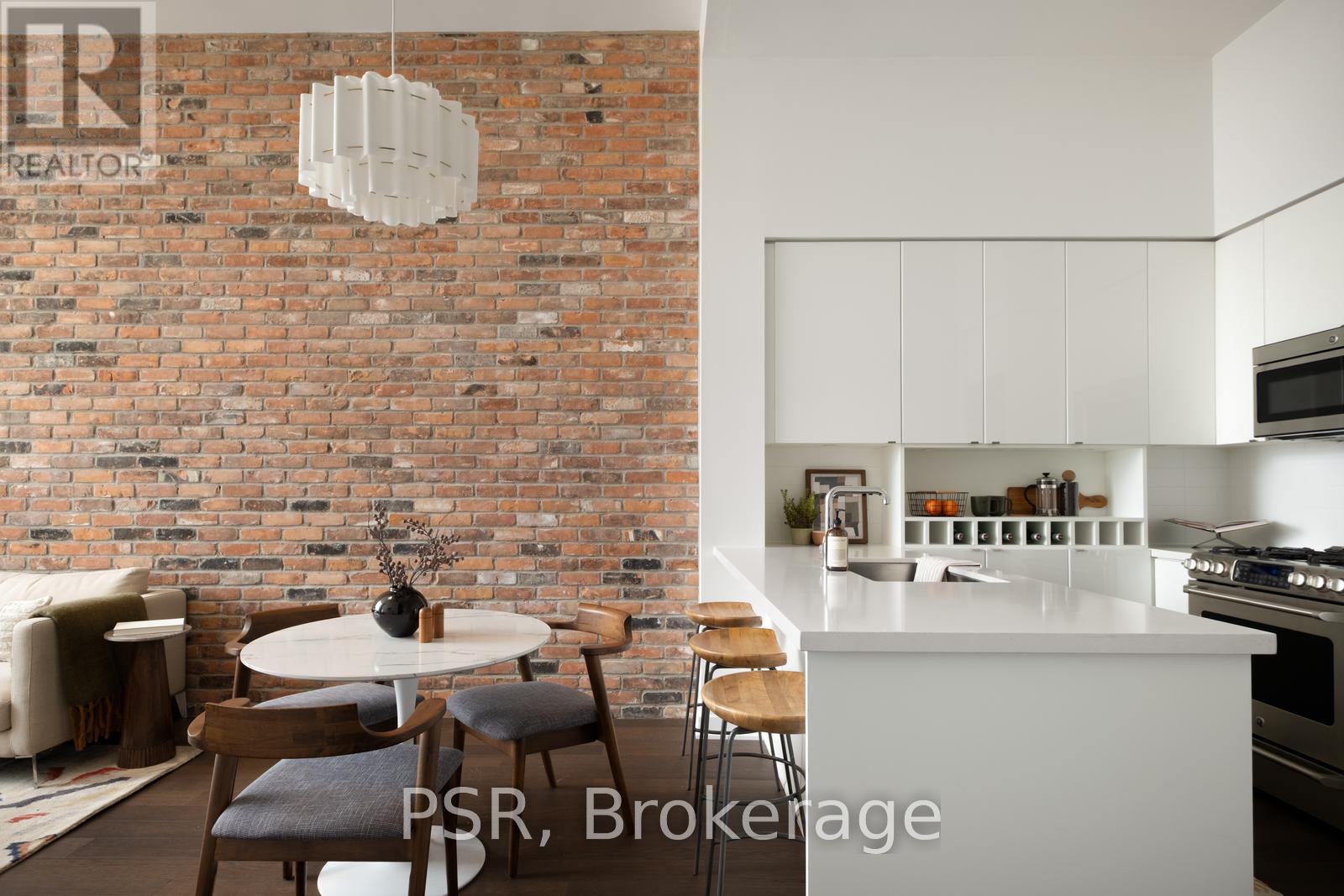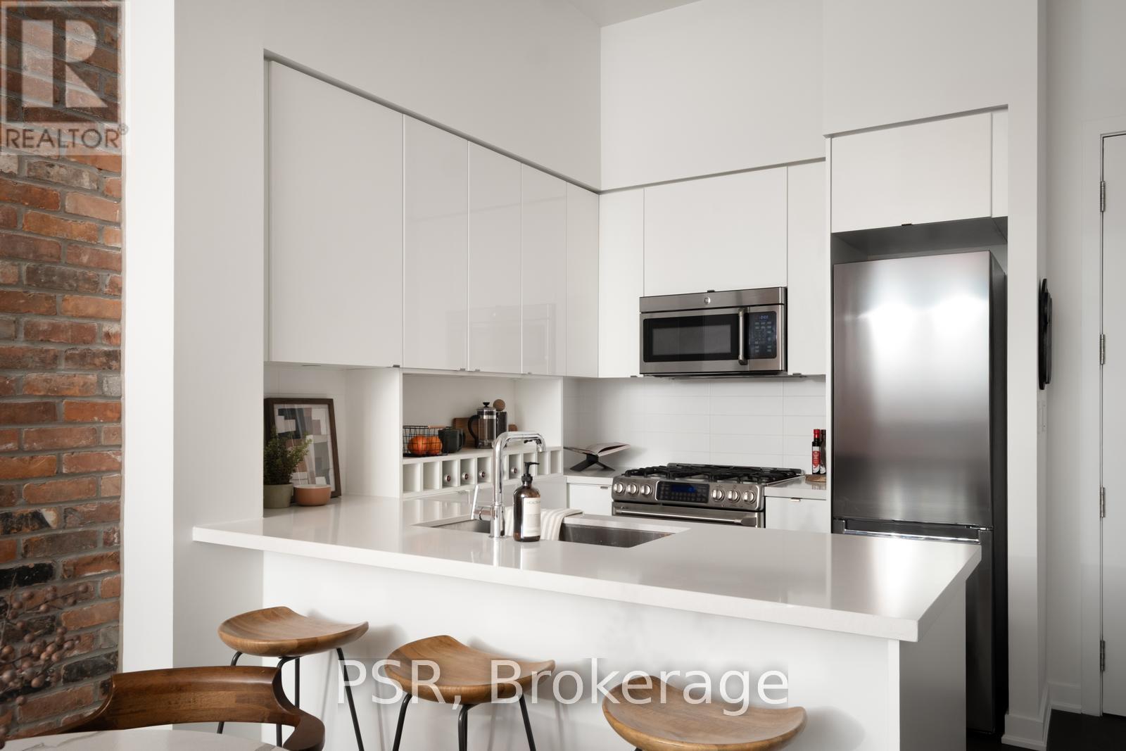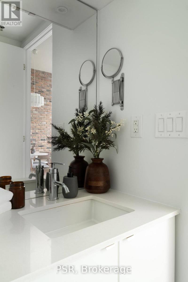 Welcome to penthouse living at Showcase Lofts in the heart of vibrant Leslieville. This beautifully updated 1-bedroom, 1-bathroom suite offers a perfect blend of loft-style character and modern comfort, featuring eco-engineered, hardwood flooring throughout and a striking exposed brick feature wall that adds warmth and personality. The chef's kitchen is designed to impress, featuring a gas stove, oversized stainless steel undermount sink, and a large breakfast bar-perfect for cooking and entertaining. Ample kitchen cabinet space and storage throughout ensures that everything has it's place, while the spacious bedroom boasts floor-to-ceiling windows that fill the space with natural light. Located on the penthouse level, this unique suite also features a rare skylight and unobstructed west-facing views of the city skyline, creating a bright and airy living environment throughout the day. The open living room offers the perfect place to relax at the end of the day, entertain friends for dinner with room for a dining table, or have room to work from home. This condo includes a parking space, locker, and bike storage unit-an exceptional bonus for city living. Residents of Showcase Lofts enjoy fantastic amenities, including a large fitness centre, party room, BBQ area with outdoor space, guest suite, concierge service, and guest parking. Perfectly situated in the centre of Leslieville, you're just steps from incredible restaurants, local cafés, boutique shops, and the TTC, with easy access to the DVP for a quick commute. Experience the best of loft living in one of Toronto's most sought-after neighbourhoods. (id:61483)